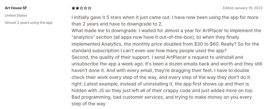 “I initially gave it 5 stars when it just came out. I have now been using the app for more than 2 years and have to downgrade to 2.” – Art House SF (United States)