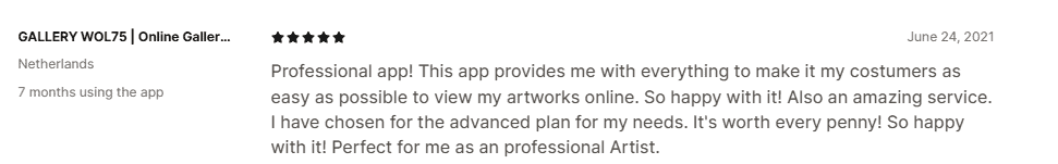 Great app to share your artwork in a profesional way. Very easy to use and has lots of useful features. Library Spaces, Virtual Exhibition Galleries and AR (augmented reality) make the difference. – Roma Rob