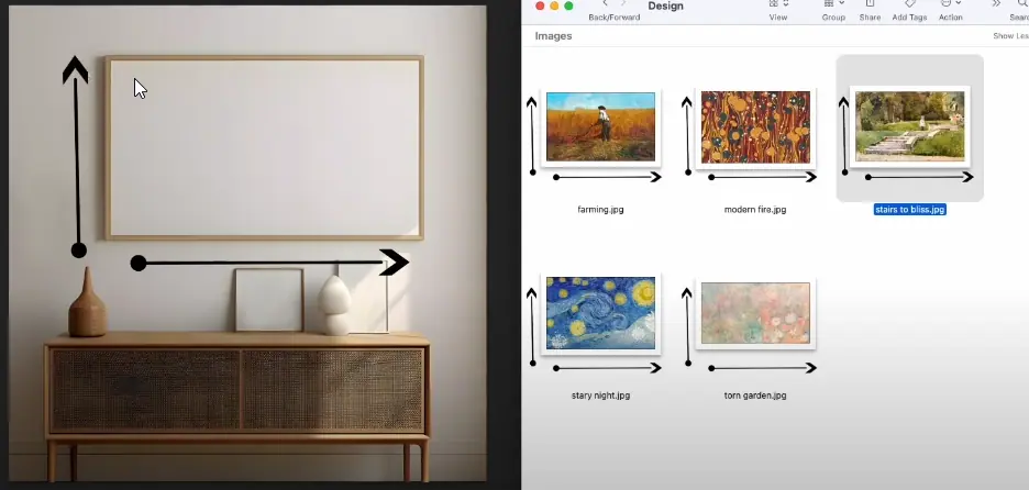 Create three folders as before, placing your wall art frame mockup templates in the template folder. Add all your artwork files to the design folder, and keep the export folder empty.