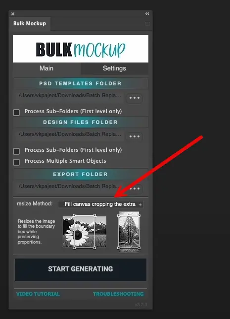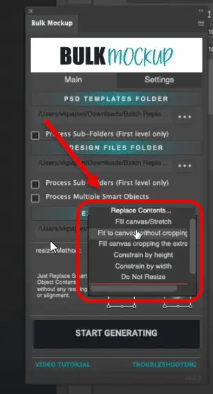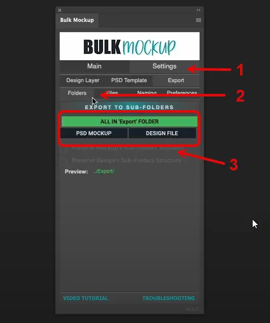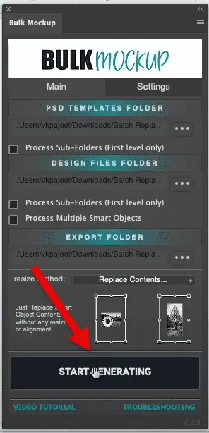 Follow the same process. Organize your PSD template, artwork or design, and export folders. Connect these file locations with the Bulk Mockup interface.