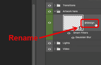 Double-click the first smart object layer and rename it to “@design”. Next, open this layer and find the nested smart object and rename it “@nested”. Save the changes for both layers.