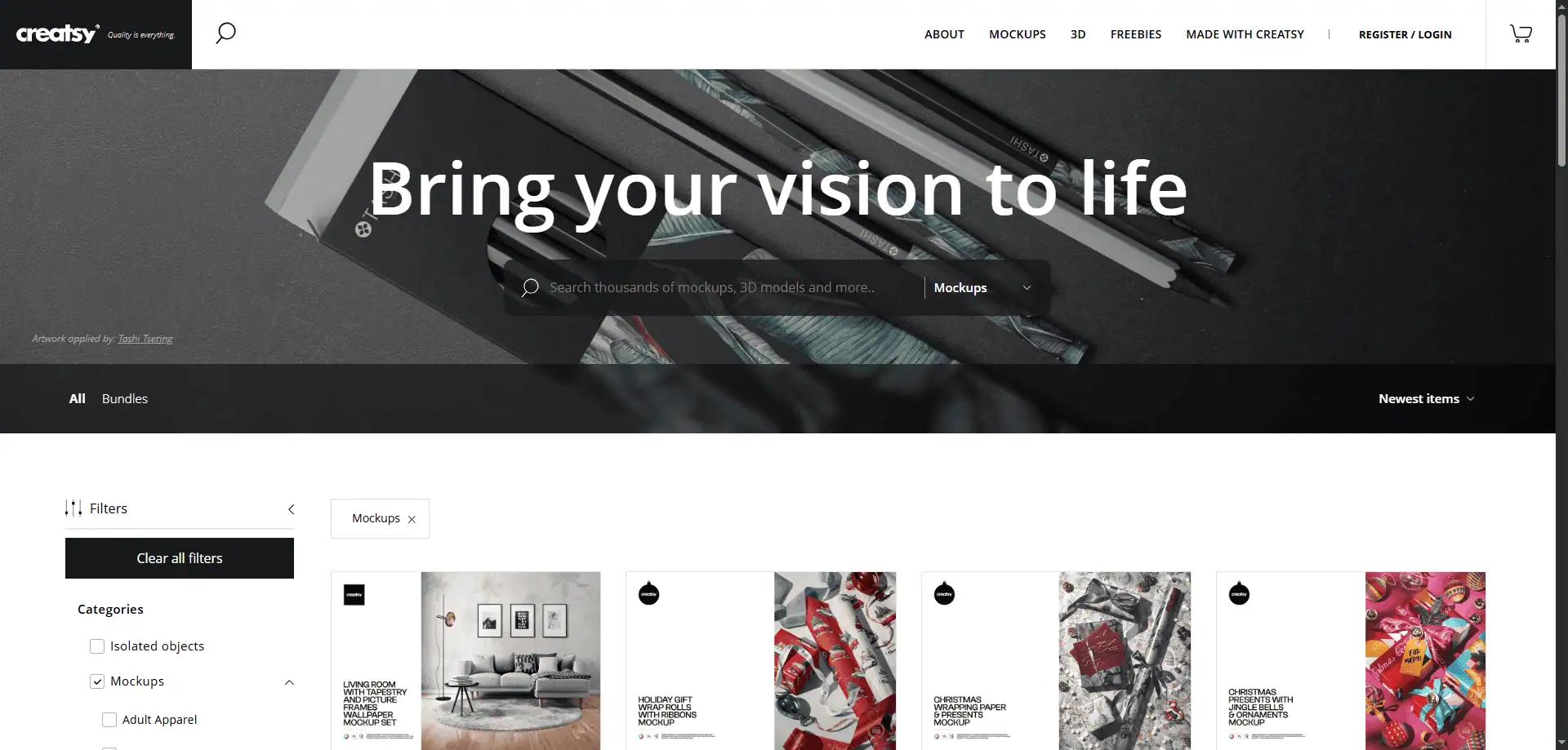 Creatsy is a specialized mockup studio known for ultra-realistic, high-resolution product mockups – especially in fashion and textiles. They sell via their own site and marketplaces like Creative Market. Creatsy is best for designers who need the highest detail or specific product types like patterned textiles, bags, etc., with meticulous quality.