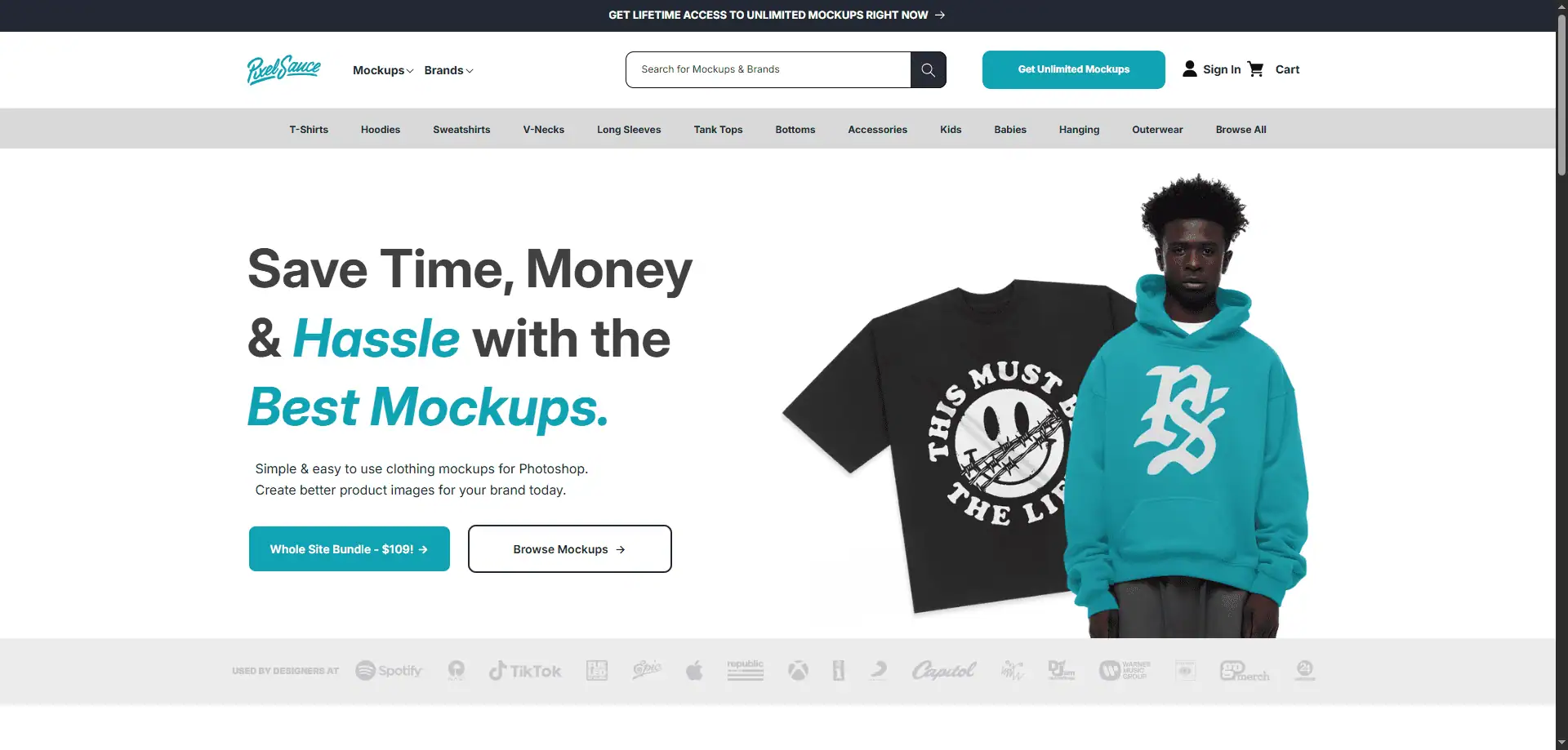 Pixel Sauce is a provider of premium Photoshop apparel mockups, famous for its mega-bundles of clothing templates. It’s best for brand owners or designers who want a complete set of mockups for t-shirts, hoodies, hats, etc., in Photoshop format. Pixel Sauce offers both individual mockup packs and a Whole Site Bundle for serious mockup needs.