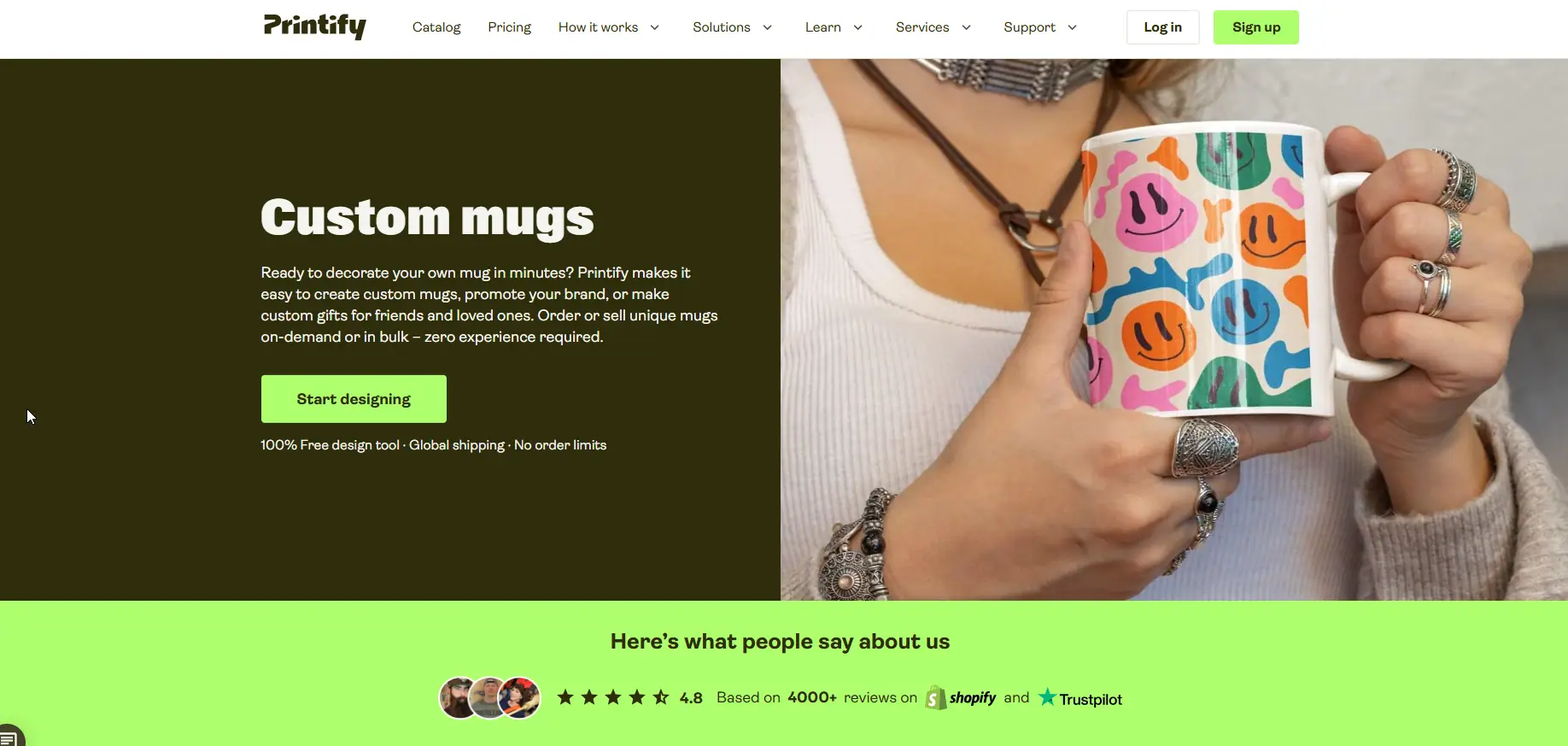 Printify, like Printful, offers a free mug mockup generator as part of their print-on-demand services. Printify stood out because of its wide variety of mug styles and customizations from classic coffee mugs to travel mugs and enamel styles.