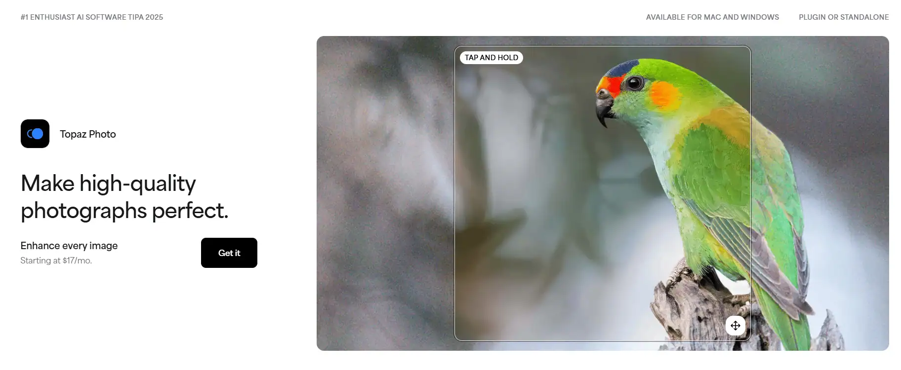 It’s especially handy if you don’t want to bounce between separate tools – one click in Photo AI, and it handles multiple issues. The downside is it can be slow on large files, and purists might still prefer manual control or Topaz’s dedicated apps for critical work. But for 90% of cases, Photo AI is a huge time-saver. It offers a free trial, and if you frequently deal with low-light or slightly soft images, it’s worth considering.