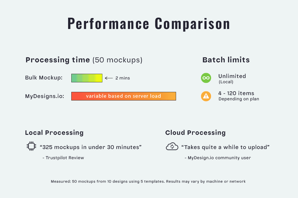 While MyDesigns limits mockup generation, we focus on speed. See how our Photoshop automation changes everything.