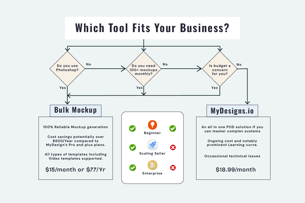 Many successful sellers actually use both strategically – Bulk Mockup for reliable, high-volume mockup generation, and other tools (possibly including MyDesigns) for specific automation needs. There’s no rule saying you must choose just one.