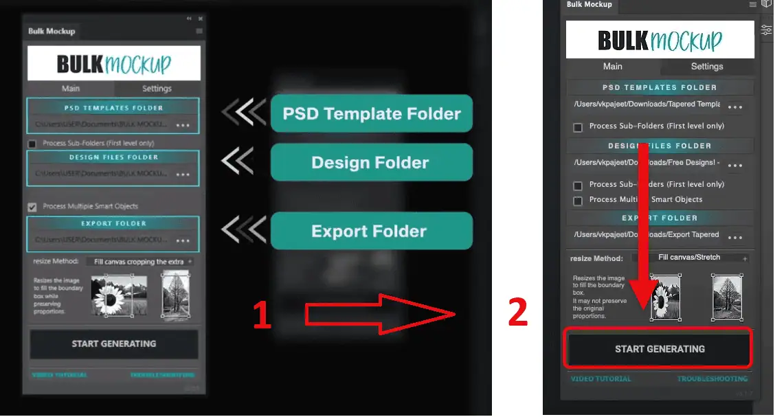 With Bulk Mockup, the process is refreshingly straightforward. Once you’ve installed the plugin in Photoshop, you simply select your folder of designs, select your folder of PSD mockup templates, choose where to save the output, and hit “Start Generating.”