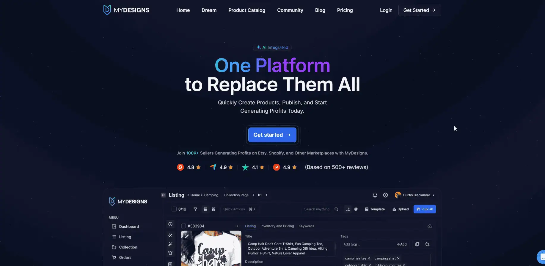 MyDesigns.io, on the other hand, positions itself as an all-in-one solution for print-on-demand sellers. It’s a cloud-based platform where you can upload designs, generate mockups, write listings using AI, and publish directly to marketplaces like Etsy and Shopify.