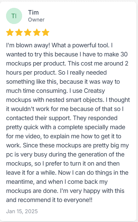 “Using Bulk Mockup has saved me so much time and headaches. Just click, sit back and watch Bulk Mockup generated mockups that would have taken hours in just seconds! Simple to use and the customization option for file naming also helps me stay organized. Customer support is excellent! Responses are quick and well explained. So glad I found this plug-in, highly recommend!” – Sinead Donnegan