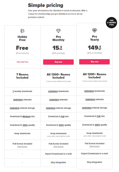 Well, Canvy has a simple pricing model for monthly and yearly subscriptions with a free subscription option to test their features. Canvy offers free membership but limits you to 7 rooms. Upgrade to the Pro Plan at $15/month for access to 1500+ rooms.