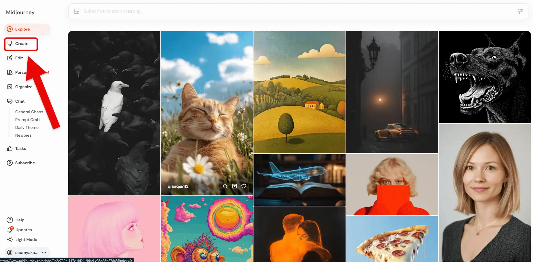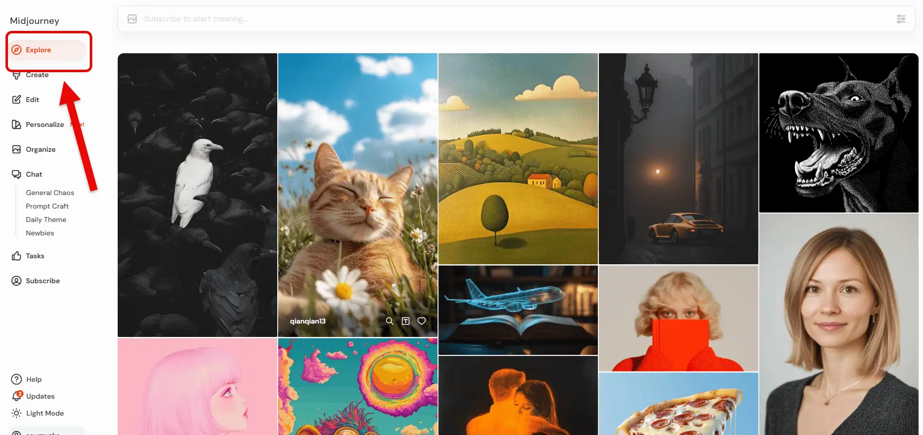 The best place to get inspiration for your wall art mockups is Midjourney. You can find creations of experienced users in its gallery section. Here’s what you have to do.