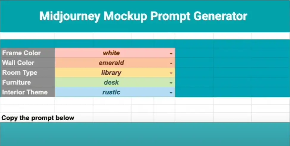 If you need help creating Midjourney prompts, I have prepared a Google Sheet. This Midjourney Mockup Prompt Generator allows you to select parameters and automatically generate a prompt.