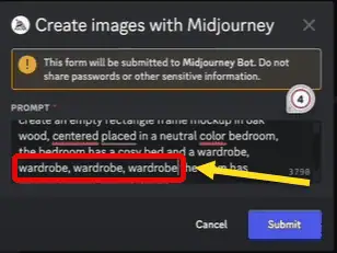 For example: “wardrobe, wardrobe, wardrobe, wardrobe”. This emphasis forces Midjourney to include your requested element.