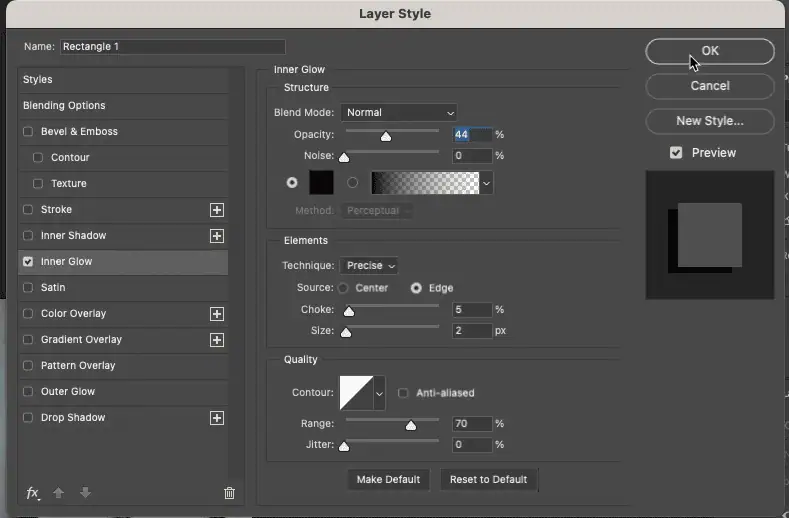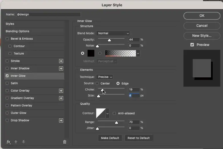 5. Add the ‘Inner Glow’ effect to create realistic shadows.