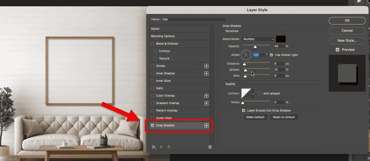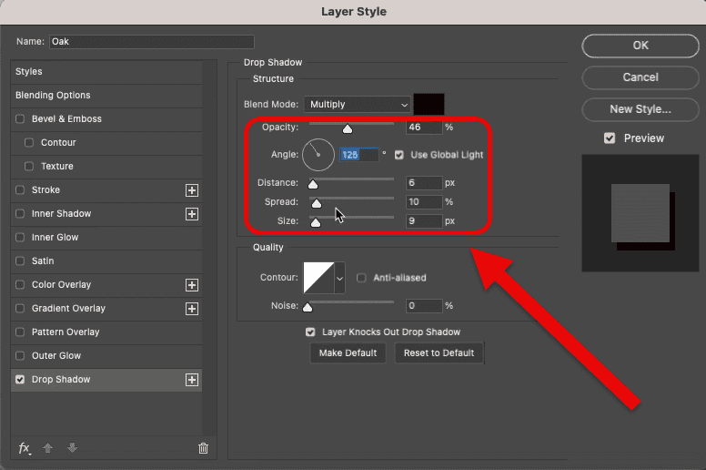 9. Adjust the angle, distance, and opacity settings based on your image lighting.