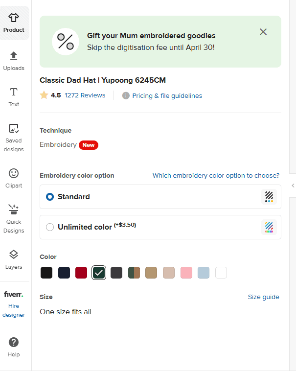 Alternatively, you can also let the fulfillment provider digitize. They charge you for digitization only after you receive an order for your product. You pay only once per design.
