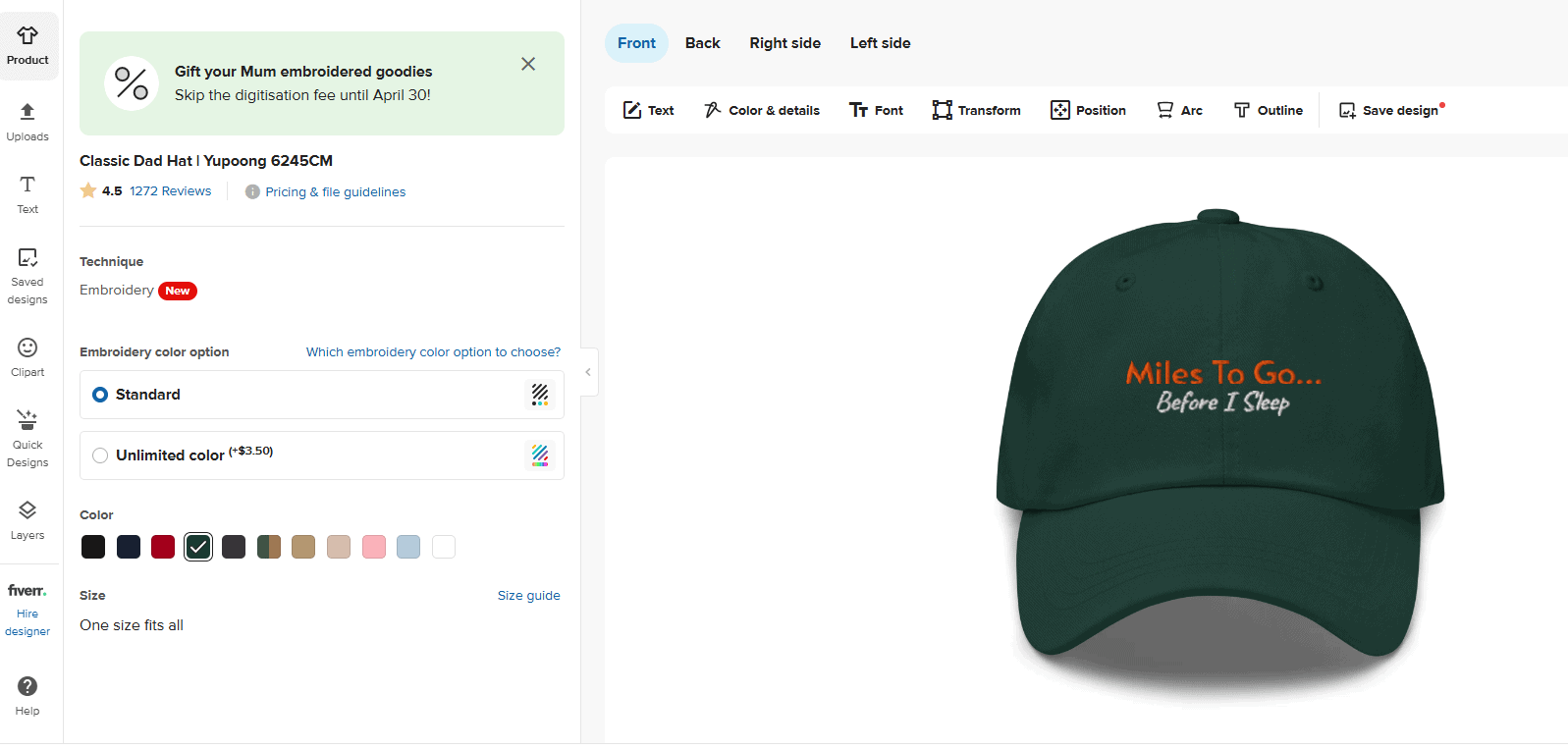 You can adjust thread color, hat color, dimensions, font style, etc.