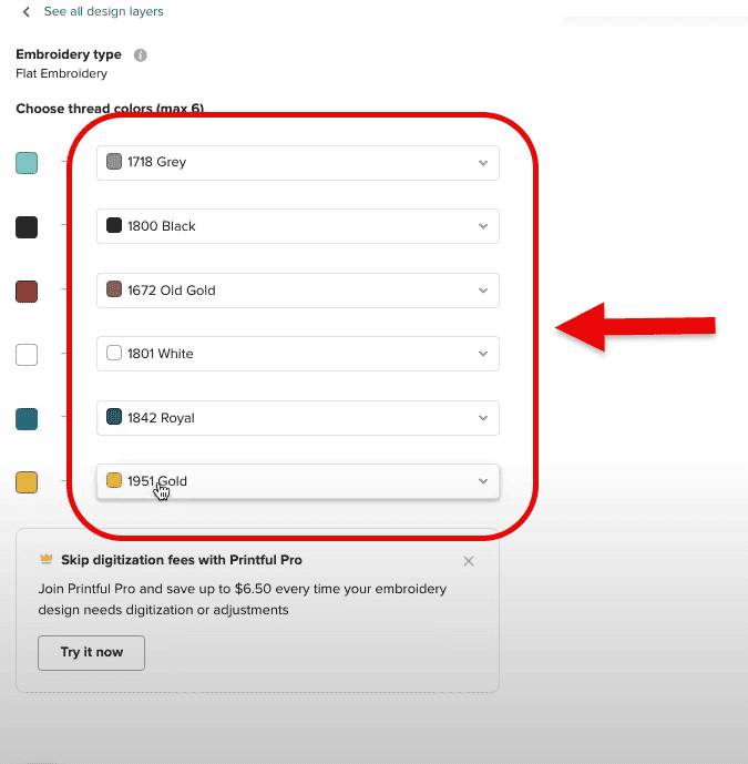 You can change the thread colors and edit the embroidery design your way. This drop-down menu lets you choose the thread colors and other elements.