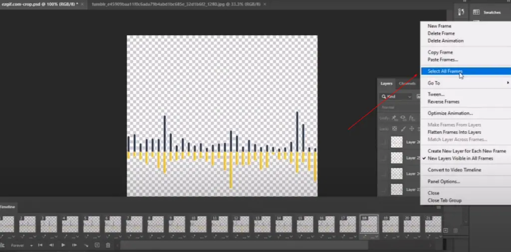 Open the GIF on Photoshop. Go to Windows → Timeline. Then from the timeline choose Select All Frames.