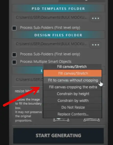 Bulk Mockup offers multiple resizing options to fit your artwork inside the template’s smart object layer. Choose the one that works best for your design style. You’ll find options for scaling to fit, centering, stretching, and more.