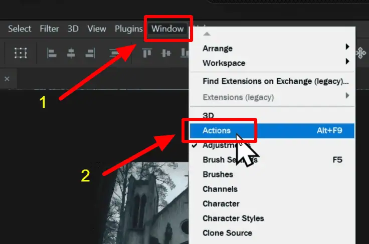 Open any image in Photoshop. Then, go to Window → Actions to enable the Actions panel.