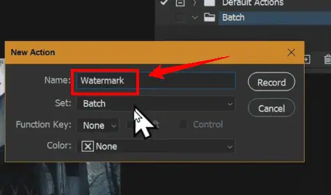 Click the + icon beside the folder icon to create a new action. Name it “Watermark” and hit Record.