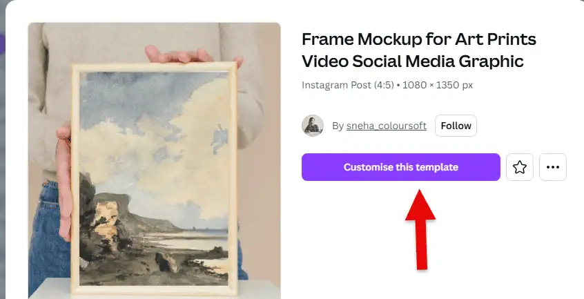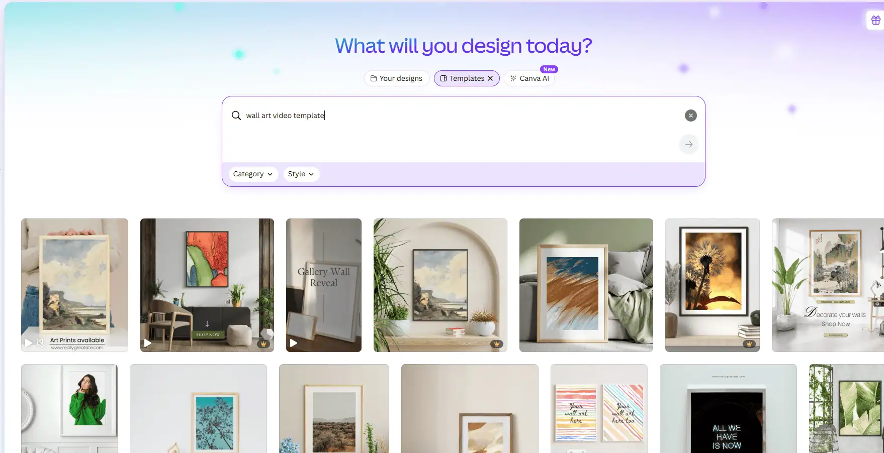 Canva has a vast library of video mockup templates you can use. Let’s consider an example of wall art video mockup creation. Follow this process step by step.
