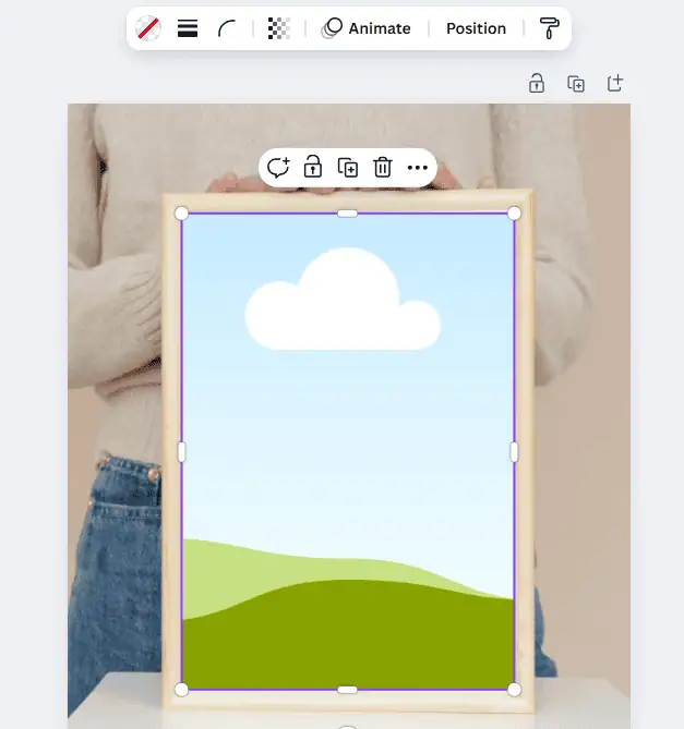 Use the frame or canvas video mockup templates available in Canva. Open Canva’s mockup video generator and put your design on the smart object layer of a frame video template. Canva will render the video and create a frame mockup.