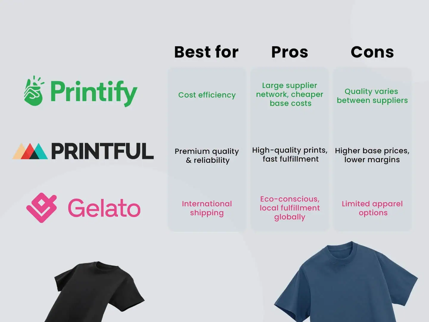 Printify | Cost efficiency | Large supplier network, cheaper base costs | Quality varies between suppliers |