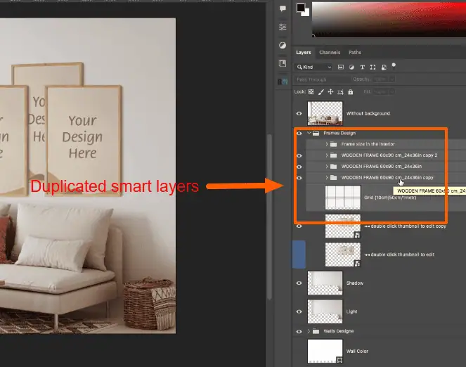 Start by opening your mockup template in Photoshop. Identify the smart object layer labeled frame designs and double-click the thumbnail to open it.