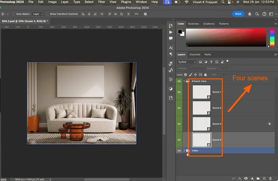 Hey thanks for sending the file. To get this done we have scene 1, scene 2, scene 3 and scene 4 and these are the video. So we’ll be using multiple smart object option from bulk mockup and see how this goes.