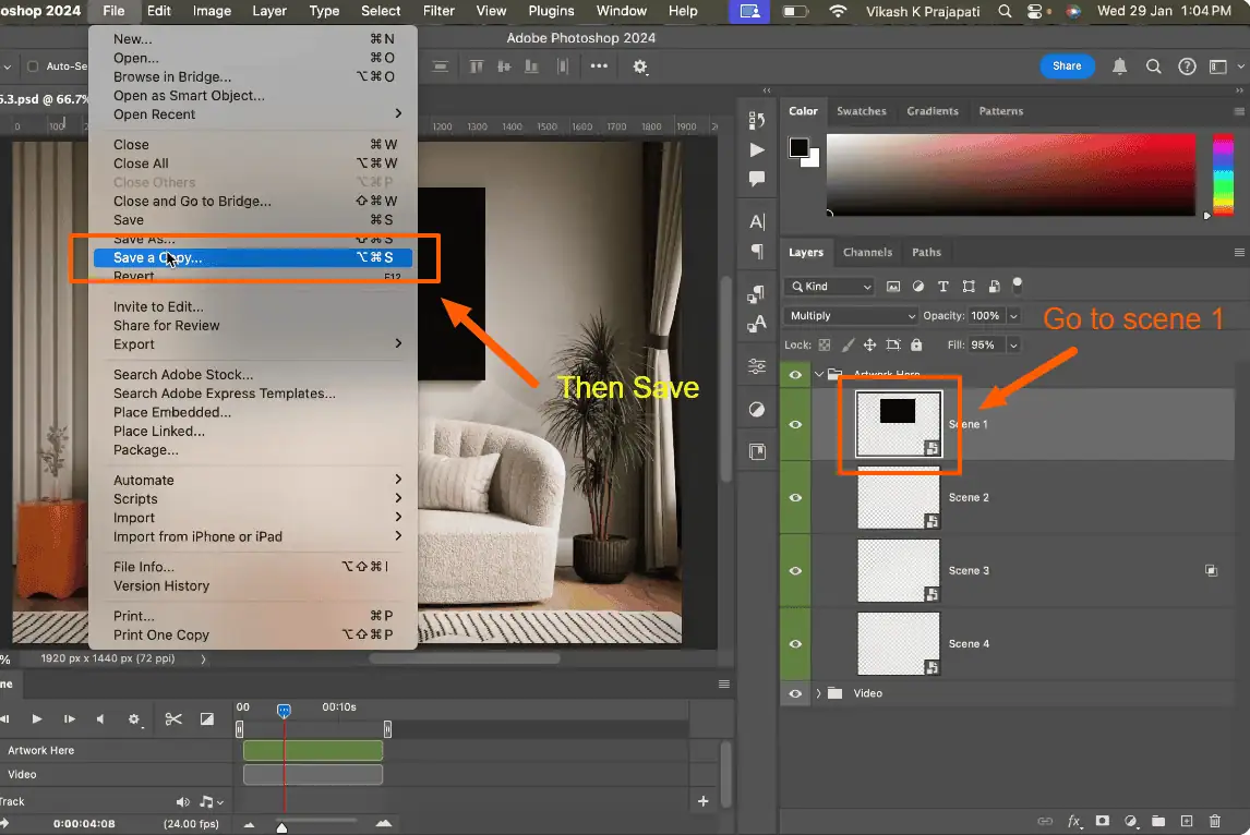 Ok so first is scene 1, so I’ll copy this and go to your arrangement that we have done. We have added the template here and then we have the design layer. So I’ll create a folder name scene 1, scene 2 and scene 3 and then we have scene 4 and let me rename it.