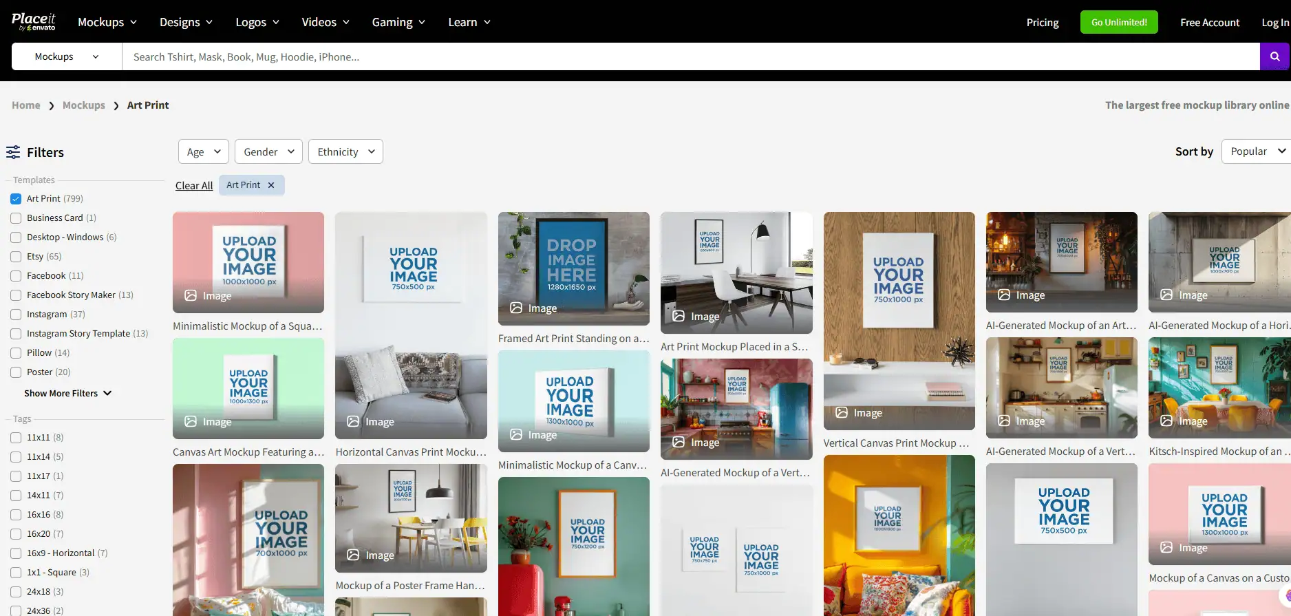 Every mockup template in Placeit’s online wall art mockup tool shows its pixel requirements, and the editor suggests similar templates for easy browsing.