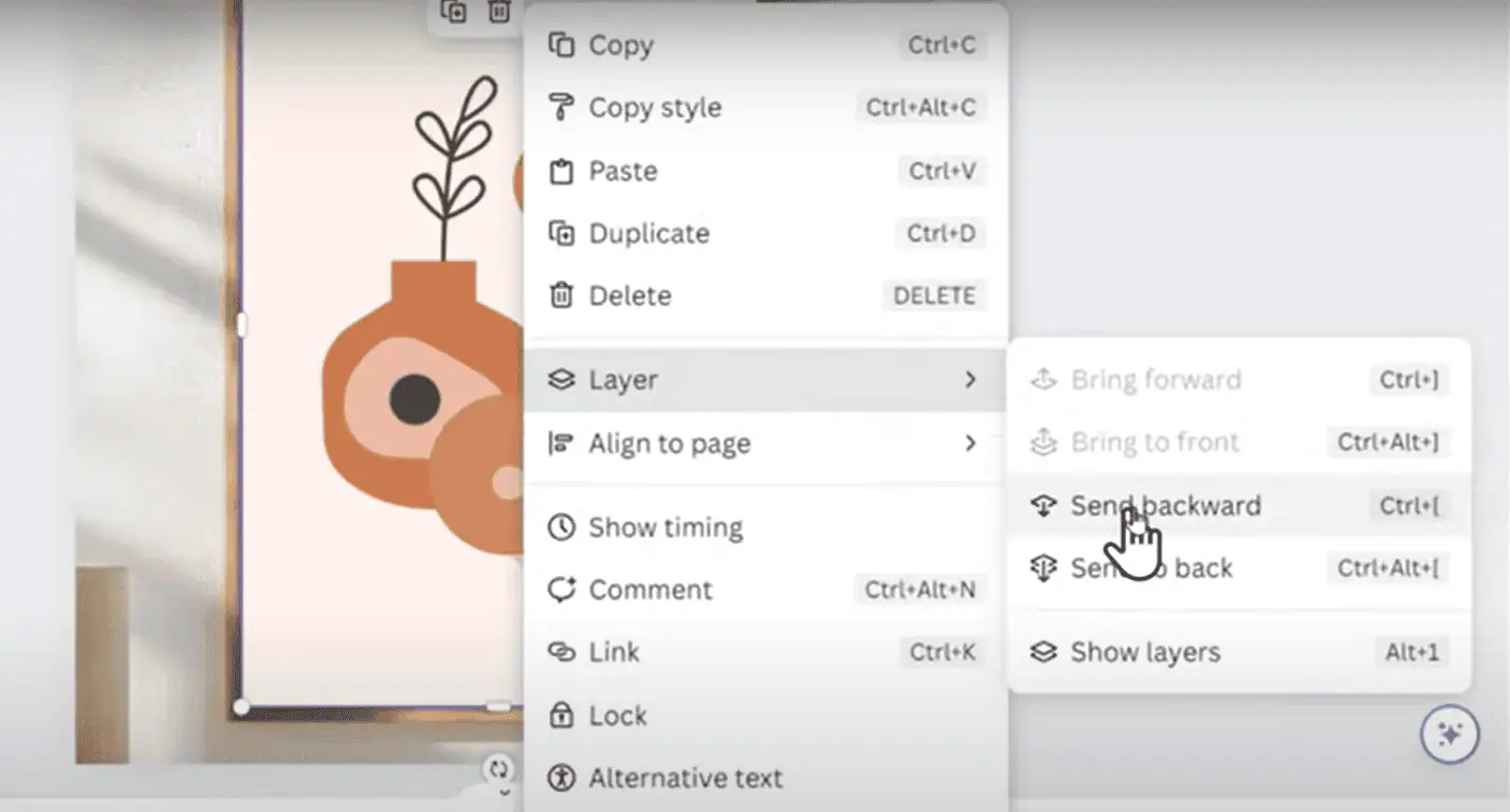 - Choose “Send Backwards” from the layer options This sequence ensures your artwork sits correctly within the mockup frame.